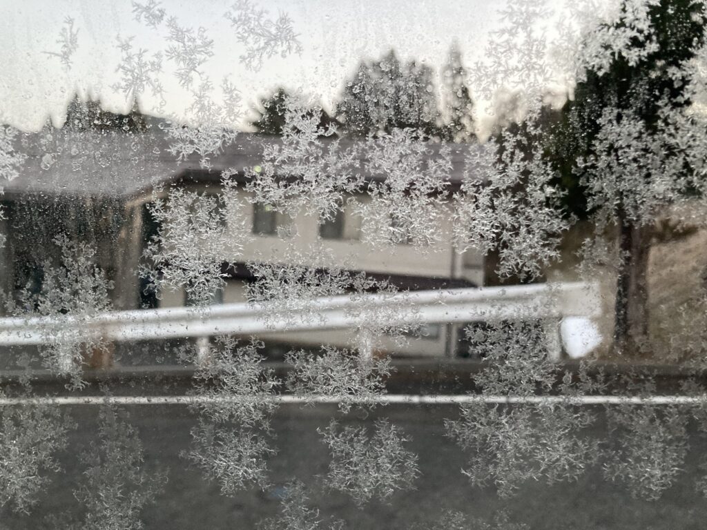 愛車の窓が氷り、外気温が低すぎて暖房してもなかなか解けなくて、でもきれいです。